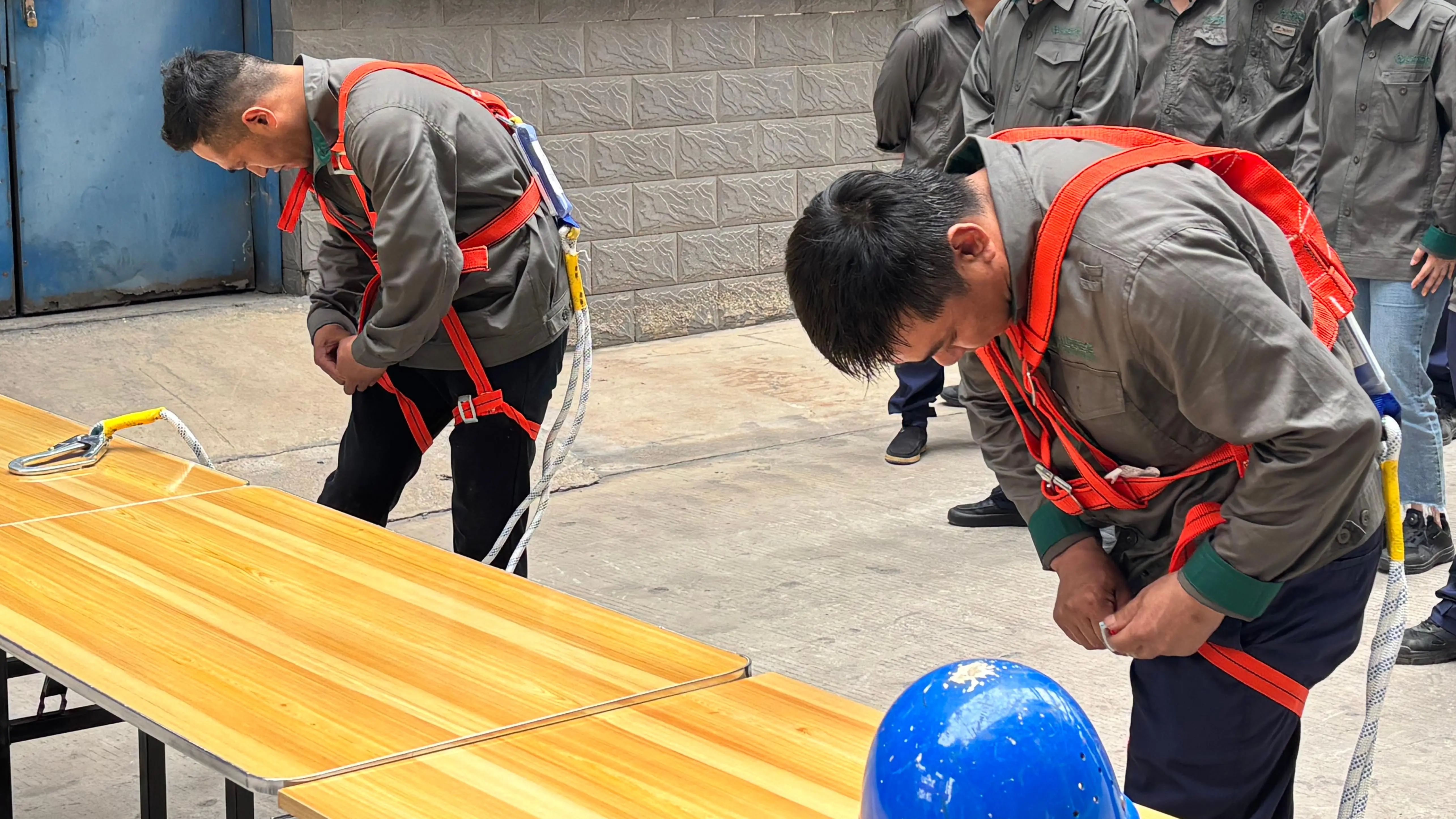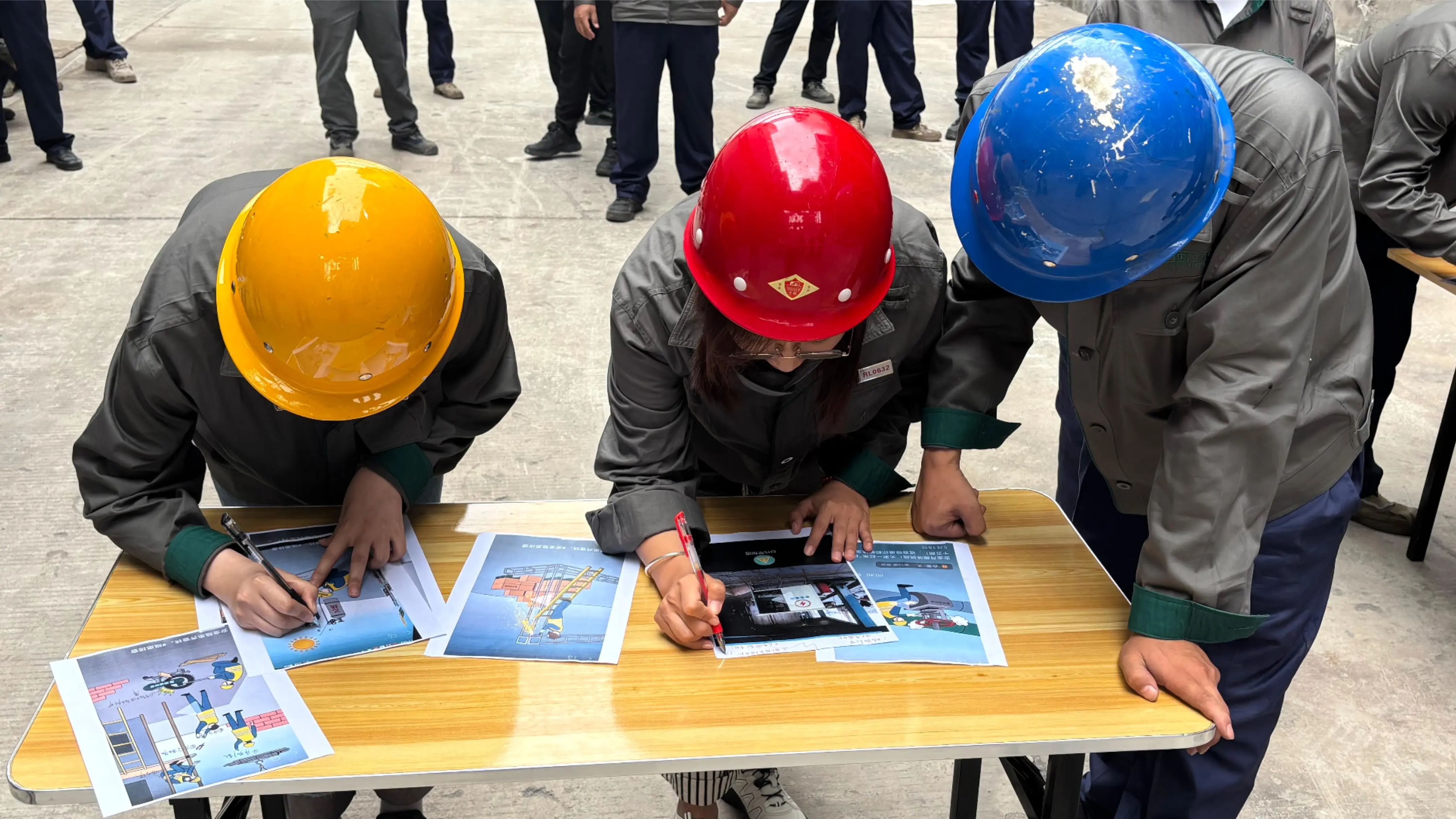 安全隱患找茬環節,通過場景模擬引導員工快速識別潛在風險;標志辨識項目以廠區、交通常見安全標識為內容,強化風險預判能力;消防服穿戴與五點式安全帶操作則聚焦實操技能,嚴格規范穿戴步驟與安全要點。競賽采用單項計分制,各環節結束后按小組總分決出優勝。