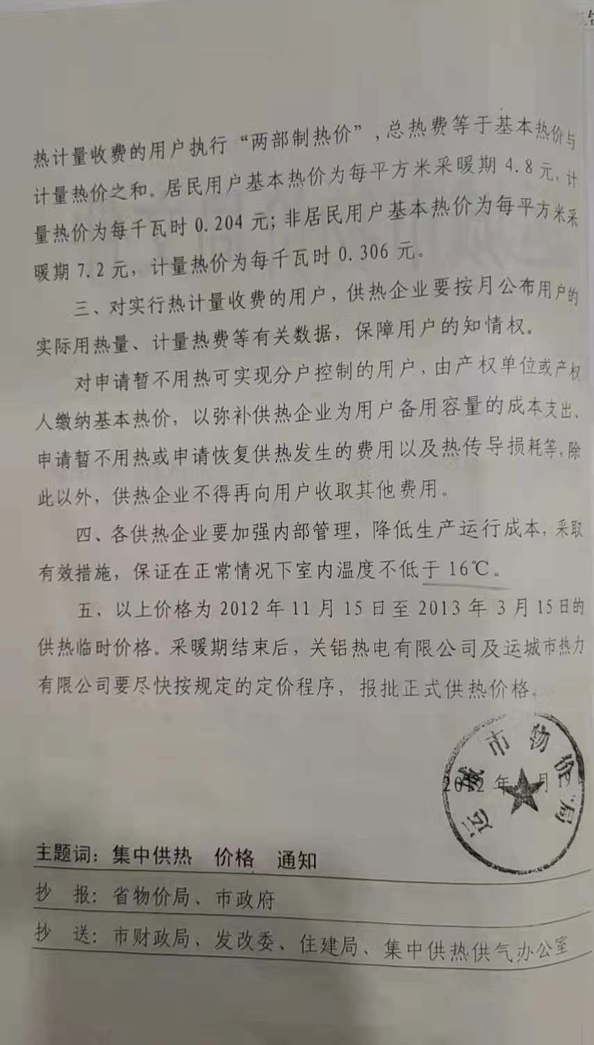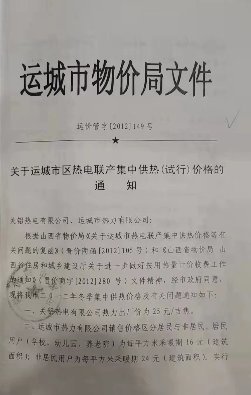 關于運城市城區熱電聯產集中供熱(試行)價格的通知
